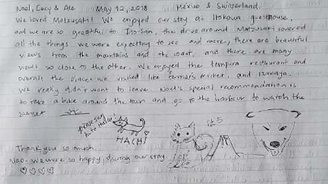 Hatchi is a five-year old shiba-ken that lives at Naoki-san's home and is not often seen at the Itokawa Guest House. Nonetheless once-in-a-while guests get to see Hatchi and immediate fall in love with him. He loves going for walks along the Okawa River over which the bridge above goes across.